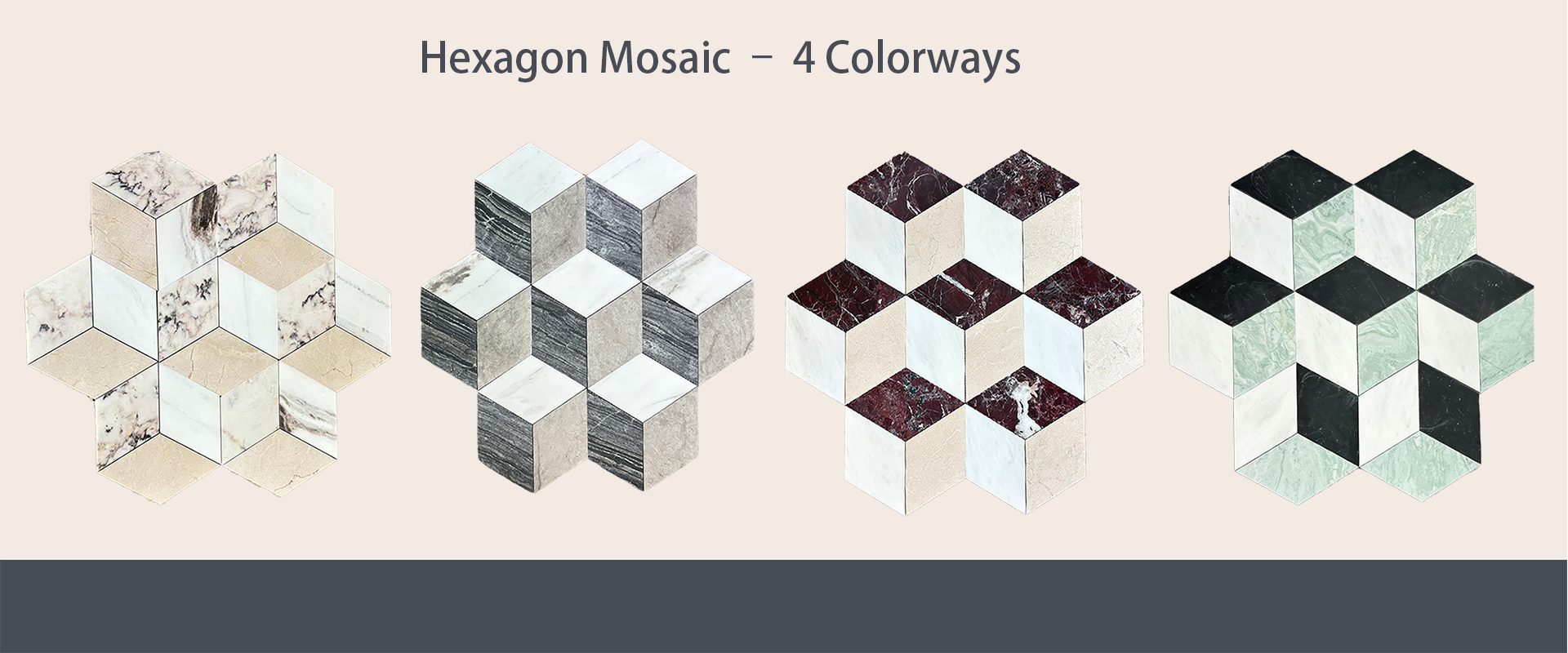 We are excited to introduce our new hexagon marble mosaic series, designed by combining precisely cut parallelograms to create a unique geometric structure. This approach gives the classic hexagon shape a richer sense of depth, movement, and visual interest—perfect for modern and contemporary interiors.