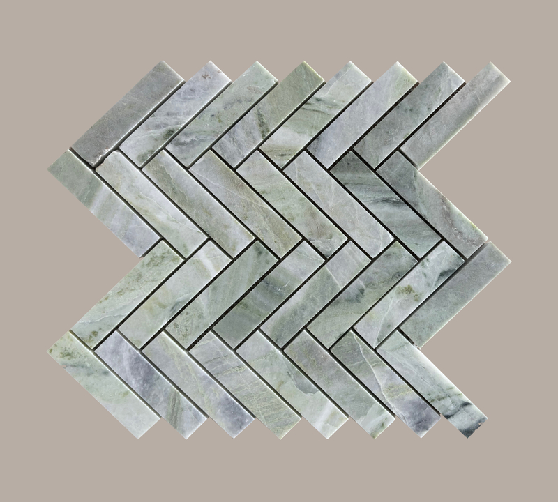 This is a herringbone - patterned marble mosaic. In terms of design, it takes light grayish green as the main color tone, with natural veins of marble distributed naturally. The long - strip stones are spliced in a herringbone pattern, forming a rhythmic and dynamic pattern, which combines a sense of order and artistry. It has a wide range of uses. It can be used for indoor wall decoration, such as living room background walls and bathroom walls, to add a fresh and elegant atmosphere to the space. It is also suitable for floors, such as foyers and corridors, to guide the vision and enhance the spatial hierarchy. It can also be used in high - end commercial places such as hotels and art exhibition halls to highlight an elegant style.
