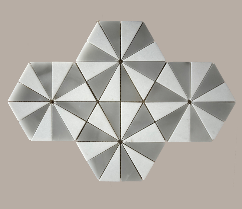 All three are geometrically spliced marbles. In terms of design, they are based on hexagons, divided into triangular pieces arranged radially, full of order and artistic sense. The colors are: off - white with light brown veins, fresh and elegant; light green with natural stone veins, fresh and lively; gray - white two - color matching, simple and modern.