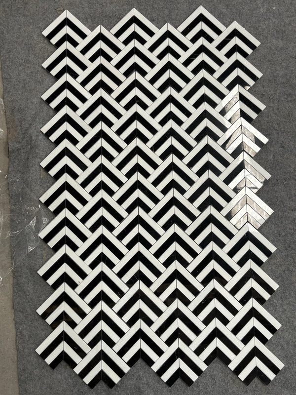 It adopts a visually striking black - and - white color scheme. The pure black and bright white collide, forming a strong color contrast that catches the eye instantly. The tiles are arranged in a neat herringbone pattern, with sharp and smooth lines. As they progress layer by layer, a rhythmic and orderly effect is created, as if there is a dynamic visual tension spreading. The high - gloss surface of the tiles is like a mirror. It not only adds a touch of modernity and elegance but also reflects light, making the entire pattern show rich changes under different lights. It is both classic and fashionable, and also has a touch of agility